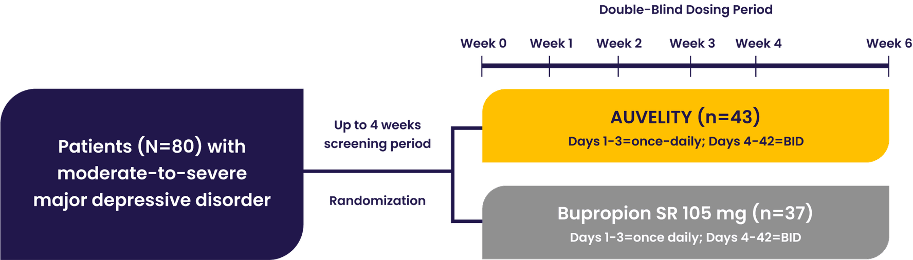 The GEMINI pivotal study was a Phase 3, double-blind, placebo-controlled study that evaluated AUVELITY vs placebo for 6 weeks in 327 patients (n=163 AUVELITY and n=164 placebo) with MDD. The study met its primary endpoint of symptom improvement on the MADRS total score at Week 6. Key secondary endpoints were change in MADRS total score from baseline to Week 1 and Week 2, response (≥50% improvement in MADRS total score) at Week 6, and remission (MADRS total score ≤10) at Week 2.1 See full study design.